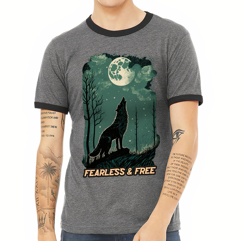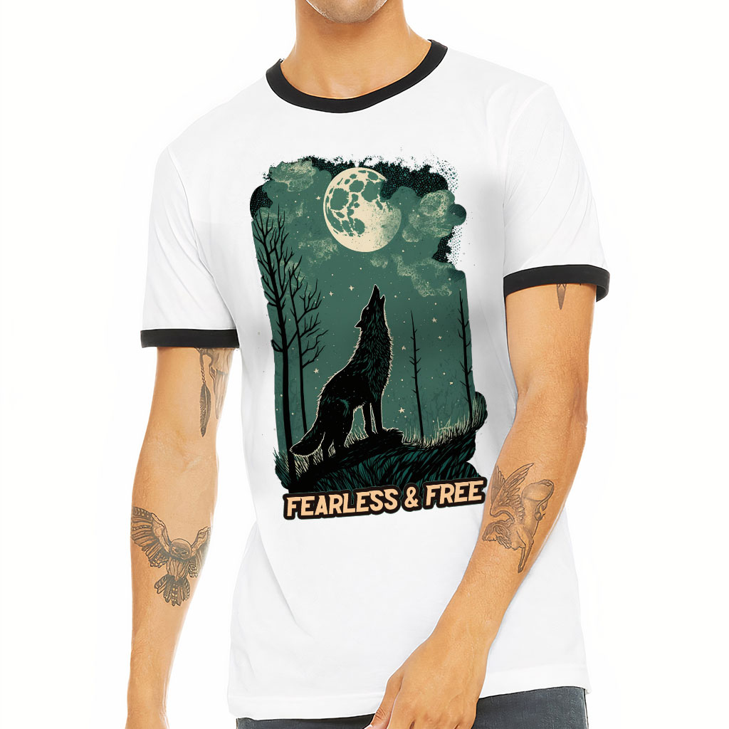 Fearless and Free Ringer T-Shirt – Howling Wolf T-Shirt – Quotes Printed Ringer Tee