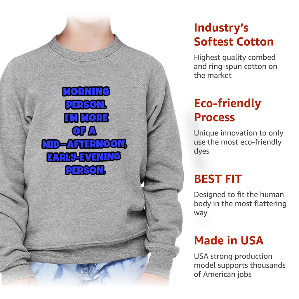 This remarkably soft pullover crewneck sweatshirt lends itself to daily wear and year-round layering. I Am Not a Morning Person Kids’ Raglan Sweatshirt features ribbed cuffs and a waistband, a crew neck, and a fashion-forward fleece fabrication.
