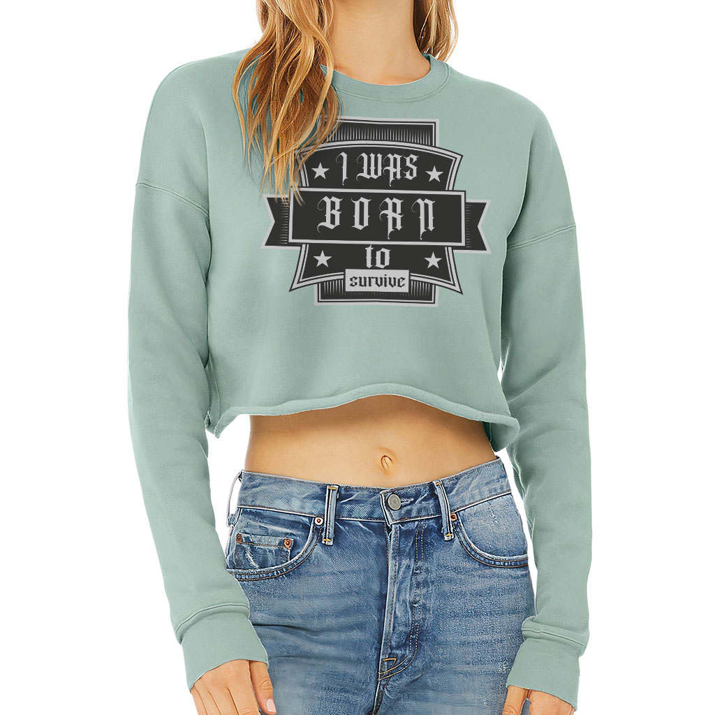 A classic women’s cropped sweater in comfy, super-soft fleece designed for warmth and breathability. I Was Born to Survive Cropped Sweatshirt features an on-trend drop-shoulder seam and a retail fit. Finished with ribbed cuffs and a raw hem finish. Offered in poly-cotton sponge fleece.