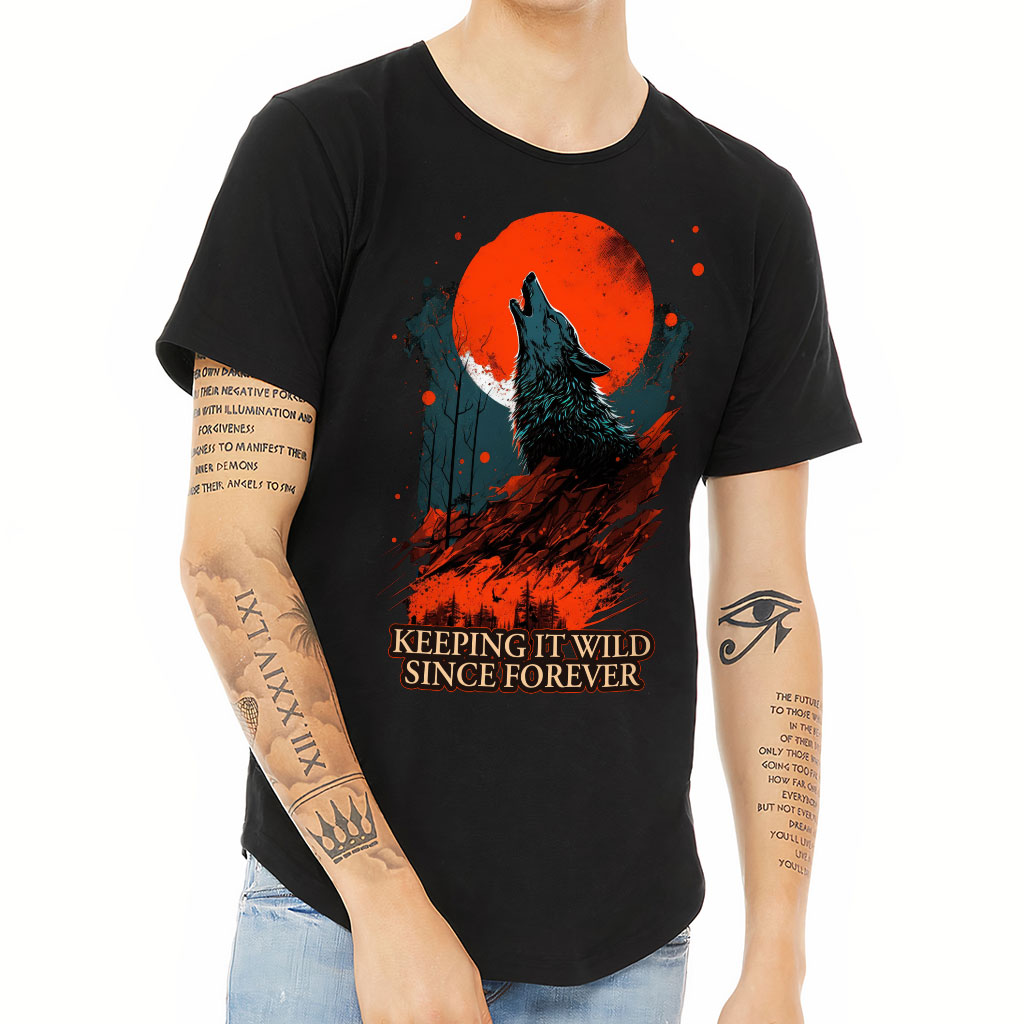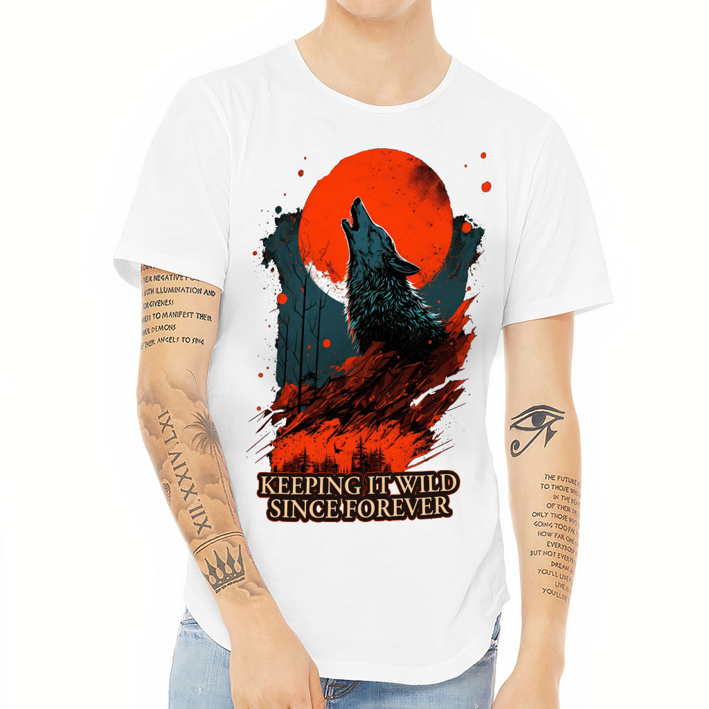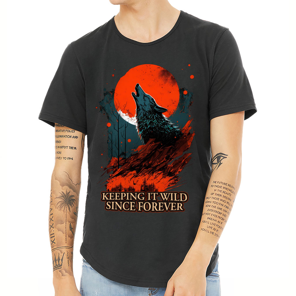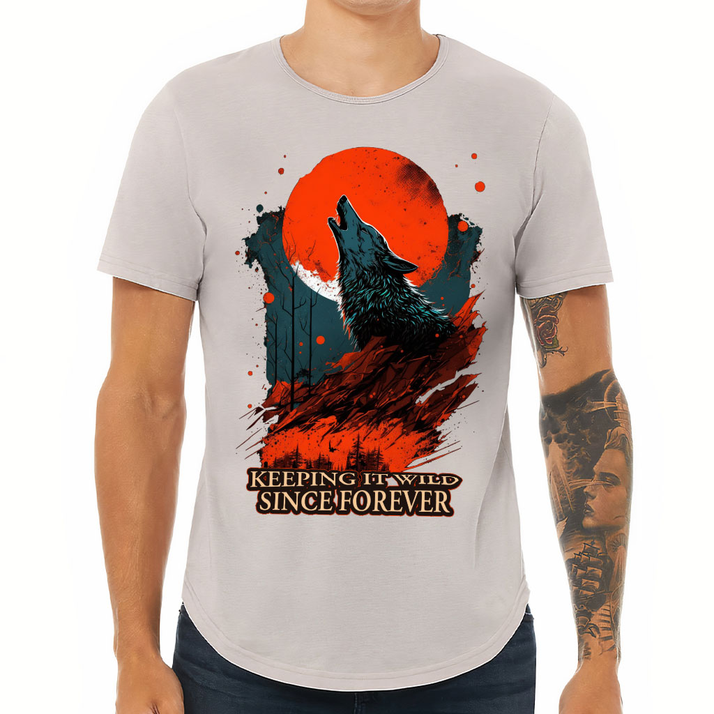 day? Check out Red Moon T-Shirt! Wolf Print Curved Hem Tee is perfect for men who want to look