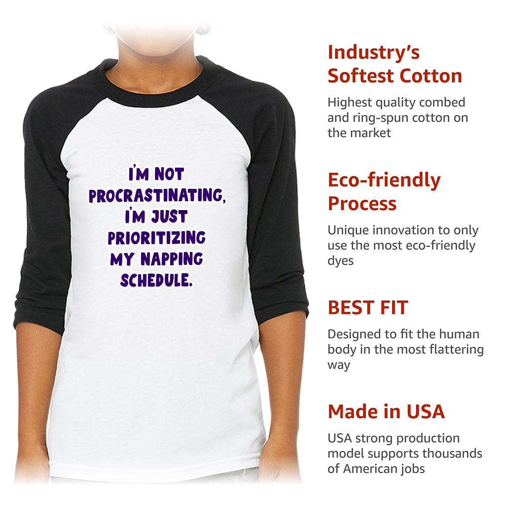 Not Procrastinating Kids’ Baseball T-Shirt is made from a comfortable cotton blend that keeps them looking and feeling cool all day long. A favorite piece that looks great on everyone and with everything; this baseball tee is essential for any child’s wardrobe.