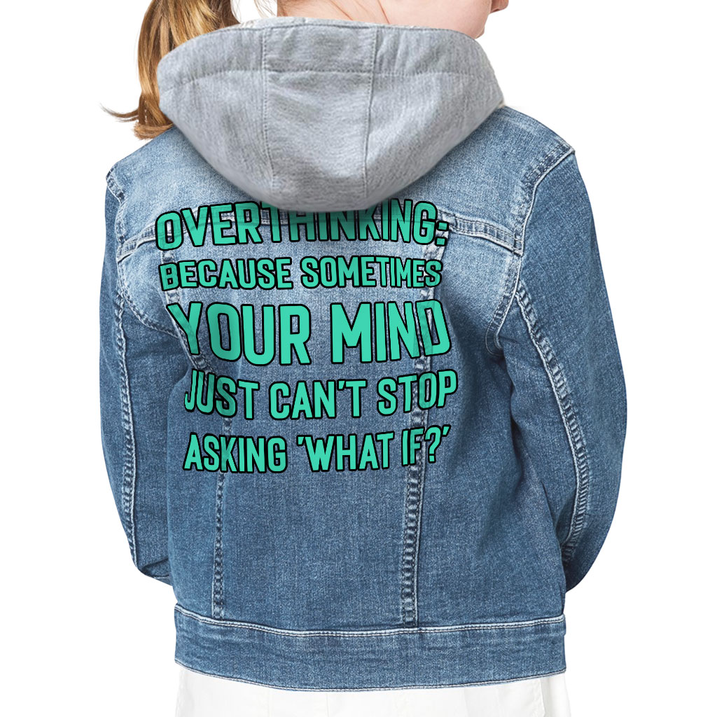 Overthinking Hooded Denim Jacket for Kids – What If Jean Jacket – Quotes Printed Denim Jacket for Kids