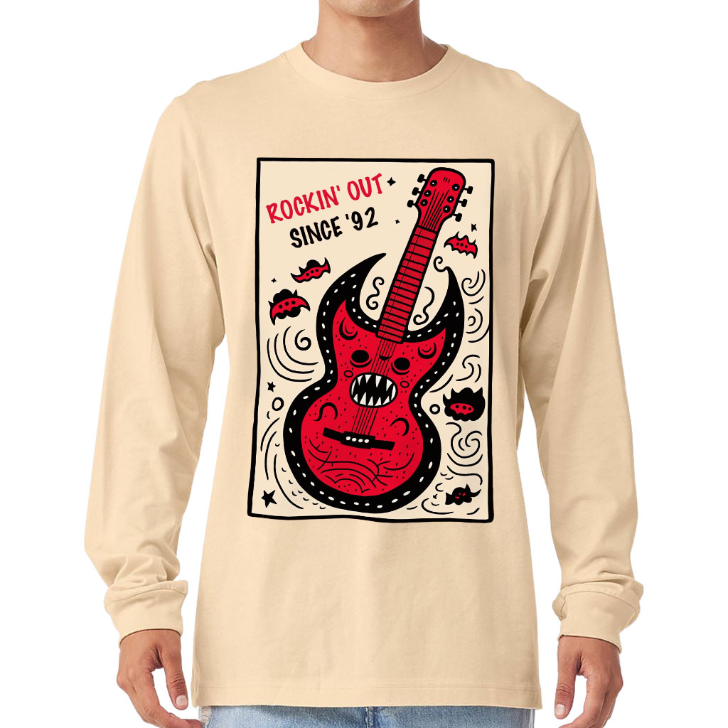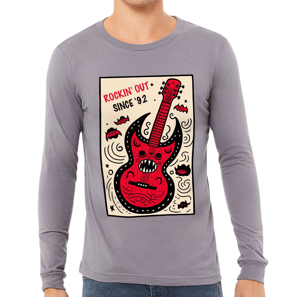 Rockin Out Long Sleeve T-Shirt is proudly made with 7x less water than average manufacturers, in recycle-friendly facilities that also guarantee zero sweatshop conditions. Rock Guitar Long Sleeve T-Shirt is designed and printed in California.