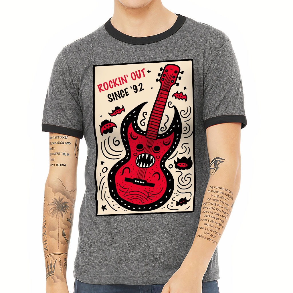 Are you looking to amp up your wardrobe? Rock Guitar T-Shirt is perfect for men who want to be seen and noticed. Crafted with great attention to detail, this men’s T-shirt features side-seaming and a retail fit that emphasizes the wearer’s shape without being overly constricting. Contrast ringer binding on both sleeves and neckline adds an extra touch of personality, making you stand out in any crowd. Whether paired with jeans or chinos, this shirt is guaranteed to turn heads no matter where your day takes you. Get yourself noticed today with Printed Ringer Tee!