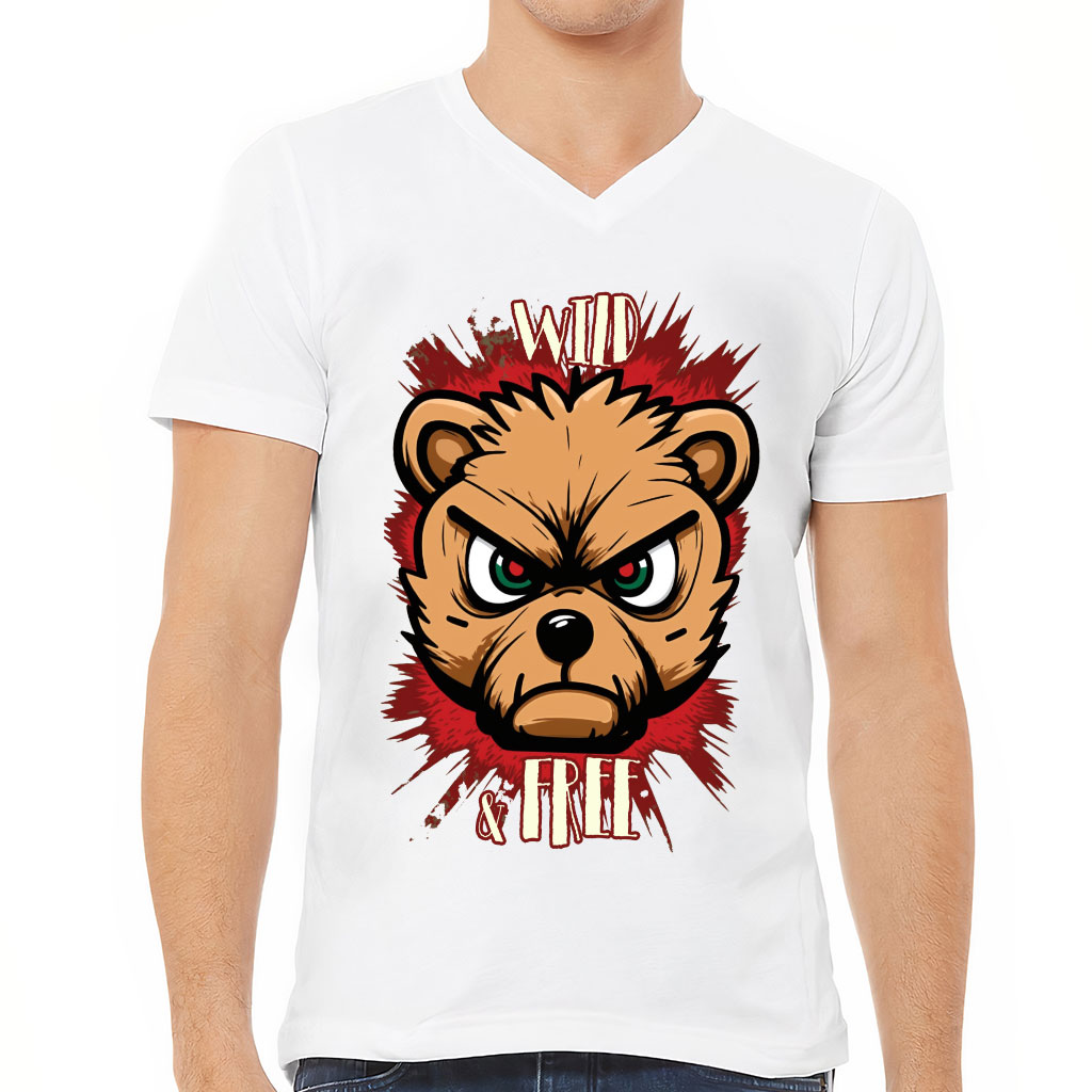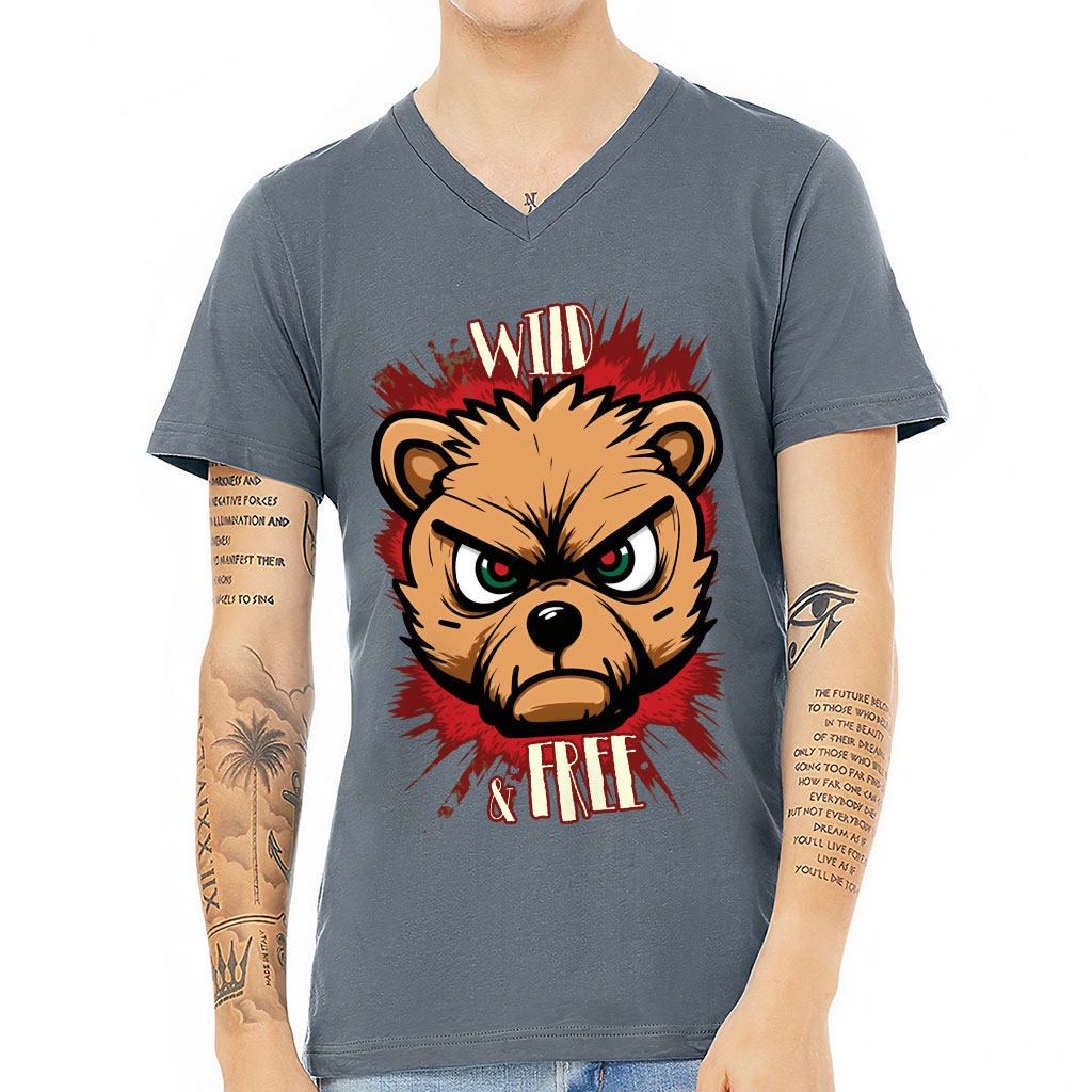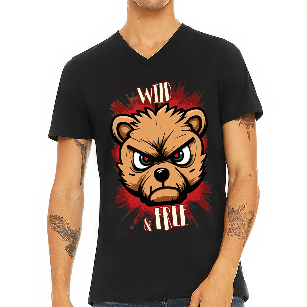 Wild and Free V-Neck T-Shirt – Cartoon Bear T-Shirt – Quotes Printed V-Neck Tee